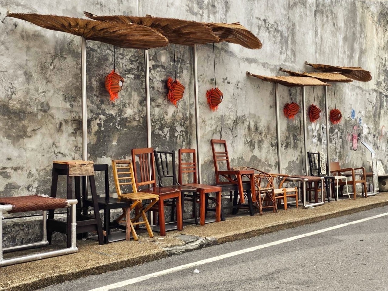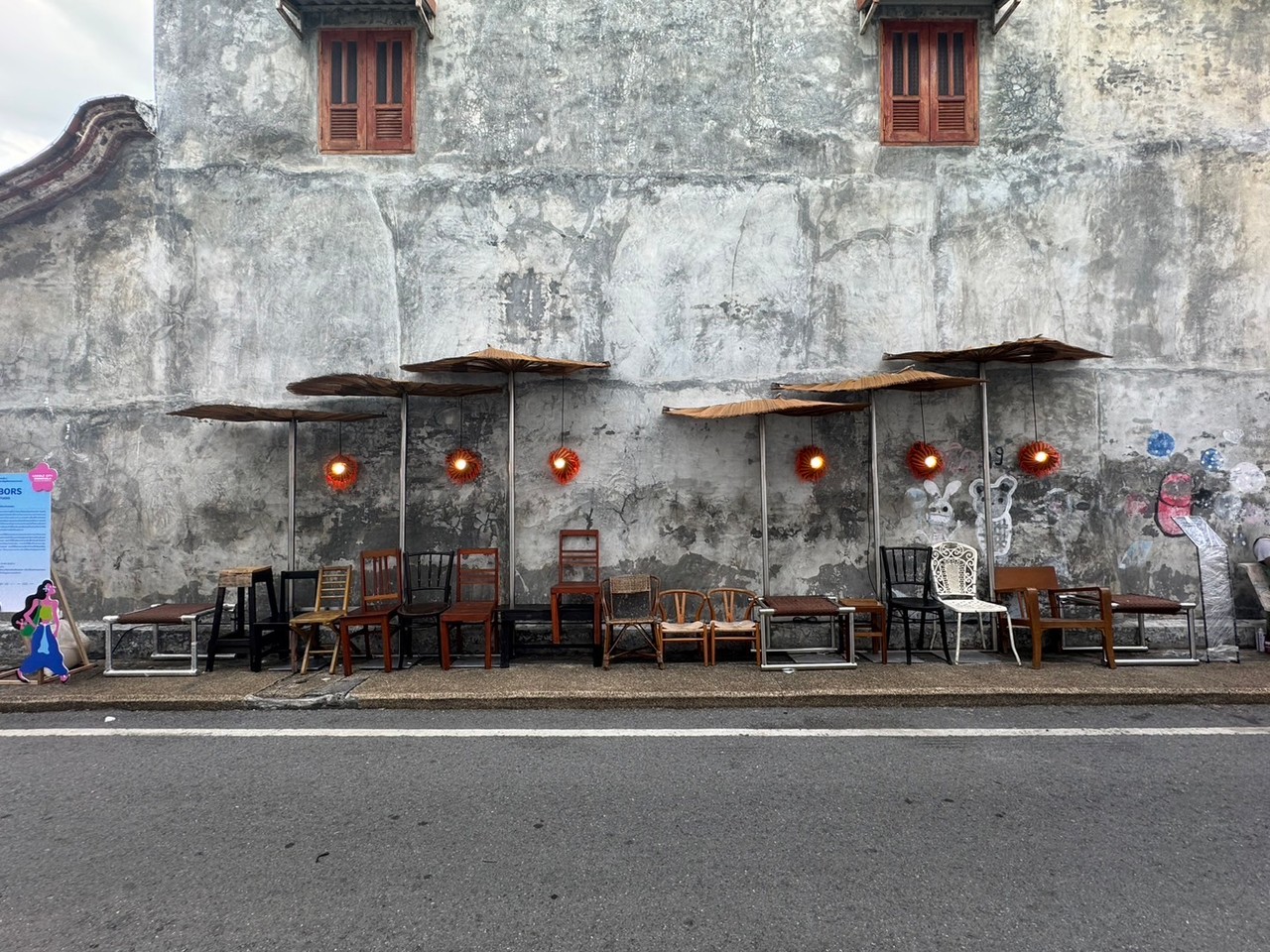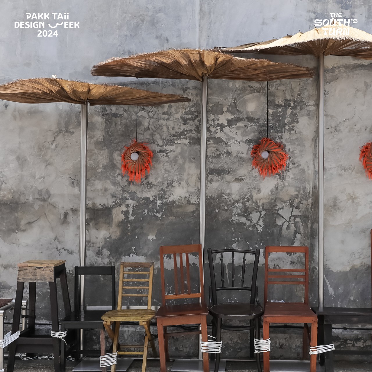 พื้นที่นั่งพักริมทาง (Street Furniture) ที่มาพร้อมเรื่องเล่า ทำจากเก้าอี้ที่ไม่ได้ใช้งานแล้วของบ้านในย่านเมืองเก่า 7 หลัง นำมาซ่อมและจัดวางเชื่อมกันเป็นที่นั่งยาว พร้อมทำร่มบังแดดและโคมไฟจากวัตถุดิบถิ่นอย่างใยตาล ตั้งใจให้เป็นเก้าอี้ต้อนรับแขกที่เจ้าของเป็นคนในพื้นที่จริงๆ และใช้งานได้จริง รวมถึงทำให้เห็นศักยภาพของวัตถุดิบท้องถิ่นในการต่อยอดผ่านความคิดสร้างสรรค์ได้ไม่รู้จบ