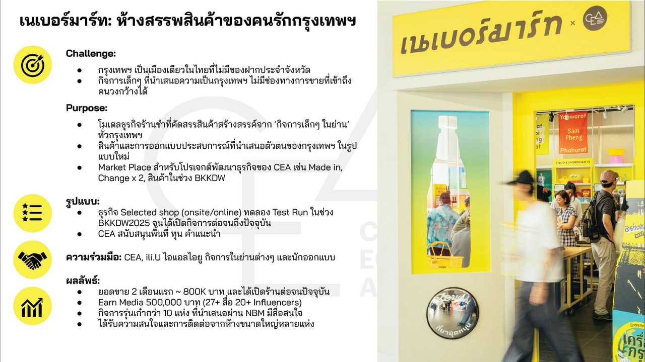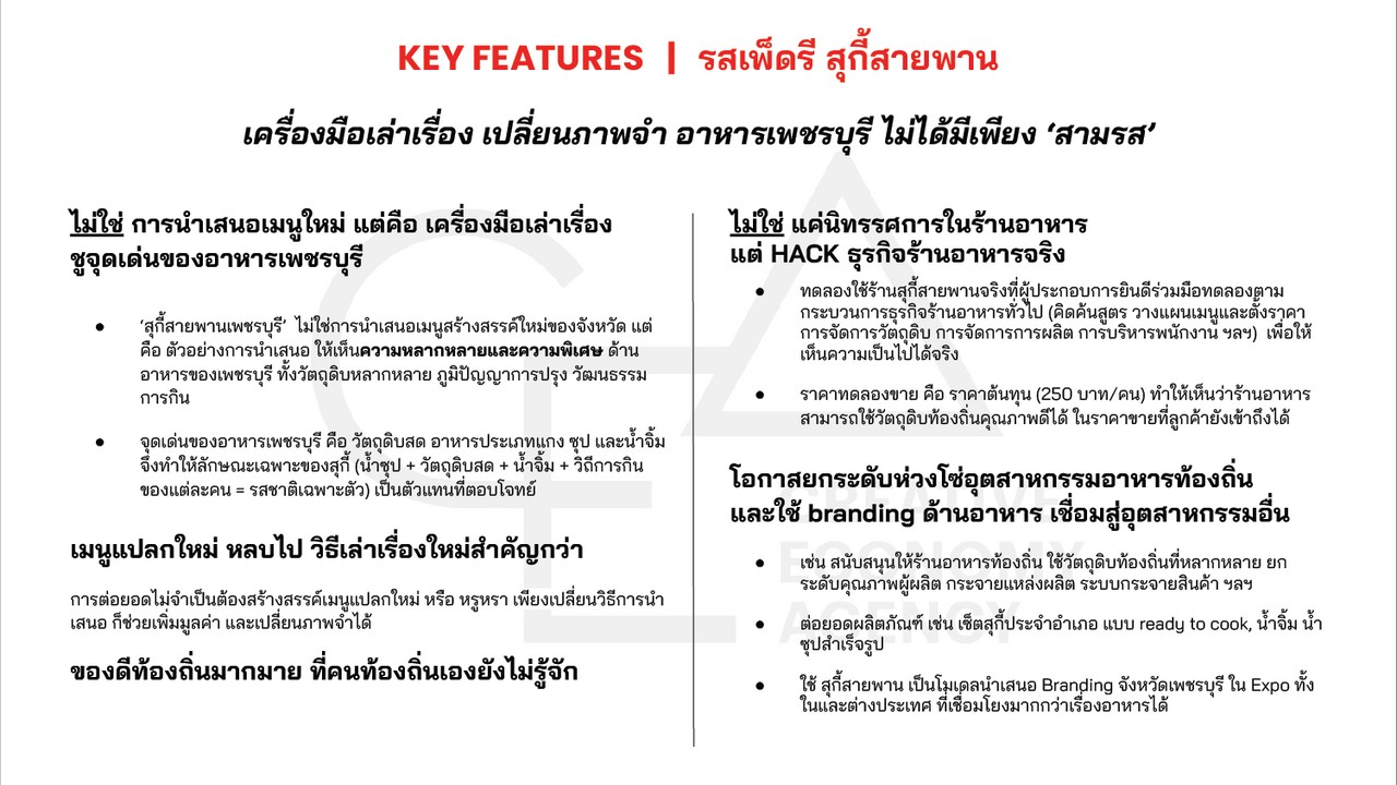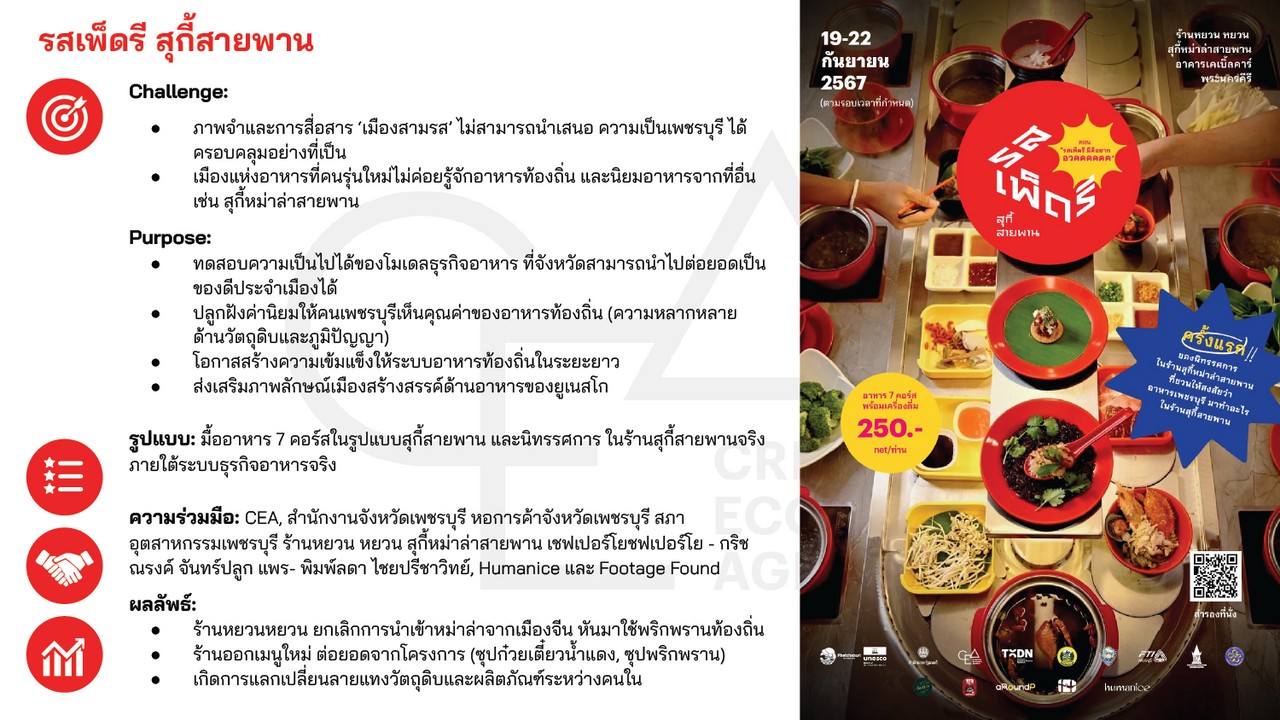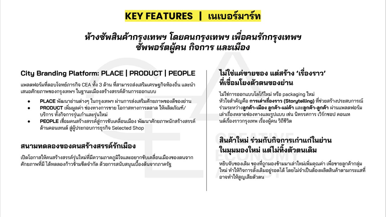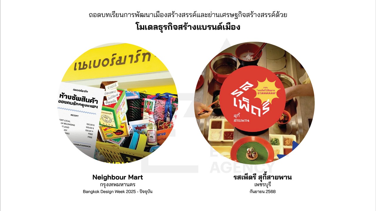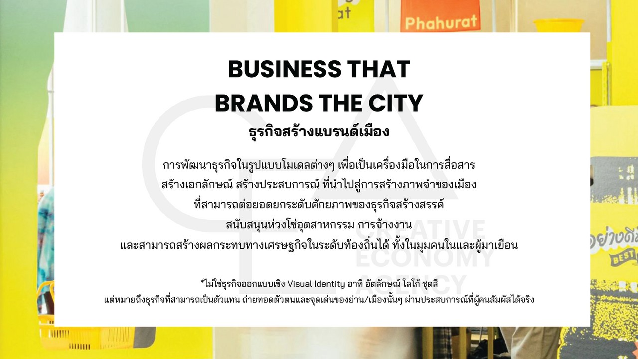 ถอดบทเรียนโมเดลการพัฒนาย่านเศรษฐกิจสร้างสรรค์ ผ่าน "ธุรกิจสร้างแบรนด์เมือง" หรือ การพัฒนาธุรกิจในรูปแบบโมเดลต่างๆ เพื่อเป็นเครื่องมือในการสื่อสารสร้างเอกลักษณ์ สร้างประสบการณ์ ที่นำไปสู่การสร้างภาพจำของเมืองที่สามารถต่อยอดยกระดับศักยภาพของธุรกิจสร้างสรรค์ สนับสนุนห่วงโซ่อุตสาหกรรม การจ้างงาน และสามารถสร้างผลกระทบทางเศรษฐกิจในระดับท้องถิ่นได้ ทั้งในมุมคนในและผู้มาเยือน